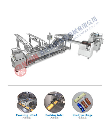 該機是我公司QNF360機型的換代產品。該無托盒包裝機使用伺服電機控制,使該機自動化程度進一步提升、性能更加穩定可靠、操作更加簡便。最顯著的特點是:包裝產品尺寸變換非常簡單。 用 途: 適用于多枚餅干的無托盤集合大包裝,方、圓、橢圓等各種形狀餅干皆可。 主要技術參數: 包裝能力:30-100包/分(據包裝膜材質,厚度及包裝規格確定) 包裝規格:長100-240mm,寬40-80mm,高40-70mm 總機尺寸:主機部分4020mm*1150mm*1840mm 供料部分3100*580mm*1130mm 裝機總容量:5.2KW, 單相 220V, 50Hz 總重量:1200kg 包裝材料:紙/PE,OPP/PE,OPP/AL/PE等適合于加熱封口的包裝材料 機械特性 l 機械結構的整體設計簡單、合理,操作簡便,調節方便 l 使用夾運輸送機構,完全可靠的解決了包裝不同長度物品尺寸變換的繁瑣及倒餅的弊病。 l 縱封裝置采用三對牽引輪構成,保證封口高速封合、穩定、美觀。 l 精巧的自動供料裝置可將包裝物準確無誤投放于主機進入包裝封口。 l 包裝尺寸調節方便快捷。 電氣特性 l 送膜、供料采用數字伺服電機控制系統 l 供料部分采用運動控制單元,供料同步、準確、自動記憶 l 變頻調速,方便、準確、可靠 l 色表追蹤點自動定位、自動跟標 l 包裝袋自動測量、記憶 l 供料位置即使在運動中也可隨意調整